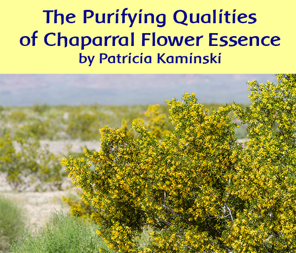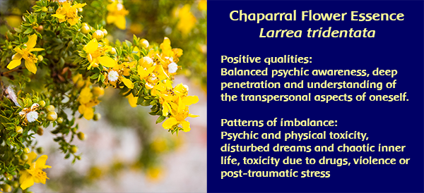 The Intriguing Gesture of the Chaparral Flower The Chaparral flower shows an especially strong alignment with the solar light element. Its radiant yellow blossoms first open in chalice-like form, receiving the full intensity of the light. Then the flowers assume a second dramatic form, as they turn perpendicular to the plane of the flower. Here we see a dynamic star gesture, a pronounced movement of cosmic forces that can be felt, even with the physical senses. This Star form is a mighty astral force, turning and whirling, working intensely into physical matter. These uniquely vivid aspects of form in the blossom, along with the capacity of the Chaparral shrub to remain resilient in severe desert conditions, and its piercing, pungent aroma, give the picture of a powerful and penetrating plant. Indeed, the Chaparral flower essence is filled with fierce solar fire, capable of bringing its purgative and purifying forces of light into the deep recesses of the soul, where darkness, chaos and entrenched trauma reside.