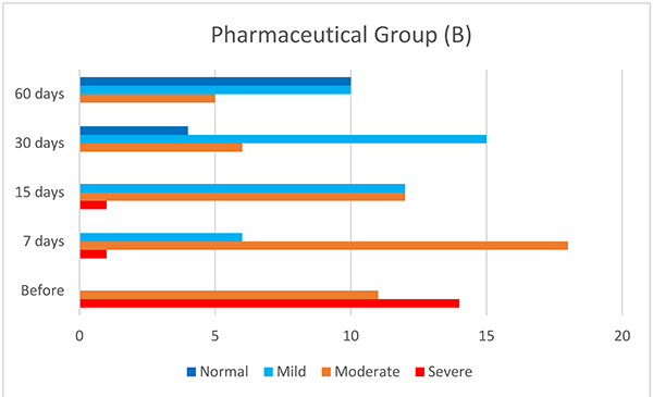 At the end of the 60 day study most of the subjects in the flower essence group (A) were assessed as “normal,” with a smaller number having mild symptoms. Those subjects who received pharmaceutical medications (B) had equal numbers in the "normal" and "mild" categories, plus some still assessed as "moderate." This means that those who received flower essence therapy made greater progress than did those who received pharmaceutical medications.
