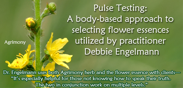 Though clients have answered and completed a questionnaire form prior to their first visit with Debbie, she asks further questions and asks them to tell their stories so that she is able to “hear” what was not written on the form. There are always emotional components, which she can sense, feel, and hear in the verbal description of their symptoms. With the ability to pulse test, she may hear one story verbally from a client but the testing result can be very different. Generally, the first story she hears told by a person is from the conscious or logical mind, but then further into discussion, the subconscious mind kicks in and that of which one is not conscious or doesn’t want to speak about begins to surface. Based on physical symptoms, Debbie first pulse tests for herbs, then for flower essences, which are used with all clients. She has follow up sessions with them every 4 weeks, then 6-8 weeks, and sees most clients for a year or more. Often Debbie at first will use Agrimony herb and the flower essence with a client: “It’s especially helpful for those not knowing how to speak their truth. The two in conjunction work on multiple levels.” If Debbie suspects that someone is not engaged in their own healing, she will pulse test for Self Heal flower essence, so she can “figure out whether or not they’re telling the truth.” Debbie also has discovered when further along into the healing process, after the first layers are addressed and one gets deeper into what has cleared, that Yerba Santa “comes on board” for nearly everyone.