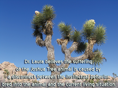 Joshua Tree – Breaking inner genetic ties passed down through breeding We at FES were intrigued to hear about Dr. Laura’s use of Joshua Tree essence for animal allergies. When we asked her to elaborate on her findings, we found out Joshua Tree not only helps mitigate allergic reactions in Dr. Laura’s practice, but has been used to effectively balance out strong genetic tendencies in some animals. The Joshua Tree essence is especially useful for strong genetic breeds – for example, Rottweilers, Border Collies, pure bred animals and birds. Dr. Laura uses this essence to interrupt the shaping forces of breed selection. She believes the suffering of the Joshua Tree animal is caused by a disconnect between the instinctual behavior bred into the animal and the current living situation. For example, a Sheep Dog is bred to herd and will often times nip at the feet of its human companions. Without breaking the energetic mapping of this instinct, the Sheep Dog will not feel fulfilled and purposeful in an apartment setting. Joshua Tree essence helps get around the genetic short circuit and works to break the connection to instinctual urges on a Soul level. This allows the animal to become present in its current living environment without being bombarded by genetic urges.