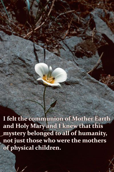 I found an old candle on the road. I took the candle and placed it on a rock and decided this rock will stand in commemoration for those who have no children. I lit the candle and in that moment the male guide arrived. He had also been upset by the woman’s remarks for he felt that the woman was saying that men are “only fathers” and therefore also excluded from the Mystery of the Blessed Mother. I remembered how Mariposa Lily grows in the rockiest most desolate places and is called by many practitioners the Madonna of the Rocks . So on that rock in Lourdes another part of my soul was opened. I felt the communion of Mother Earth and Holy Mary and I knew that this mystery belonged to all of humanity, not just those who were the mothers of physical children.