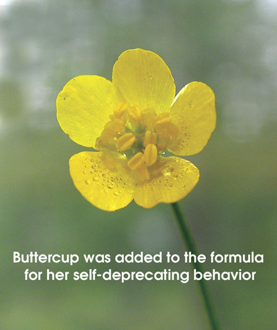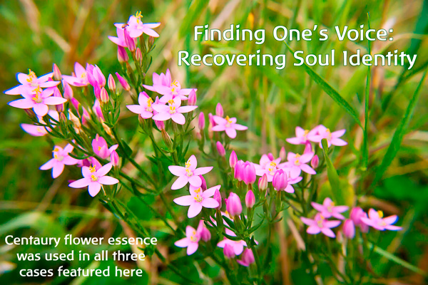She said that she started to speak up for herself rather than just caving in. She realized also that she had missed that voice during all of her life. She had better improvement of her self-image, she began to express herself, there was a reduction in her anxiety, and she was more positive. Next, I added Buttercup to the formula for her self-deprecating behavior. Subsequent formulas included Centaury , Cerato (to accept her inner knowing rather than looking to me for answers), Black Cohosh , Borage (remedy for courage), Evening Primrose (her parents were pregnant with her before their marriage; rejection and judgement from others and to get her voice back).