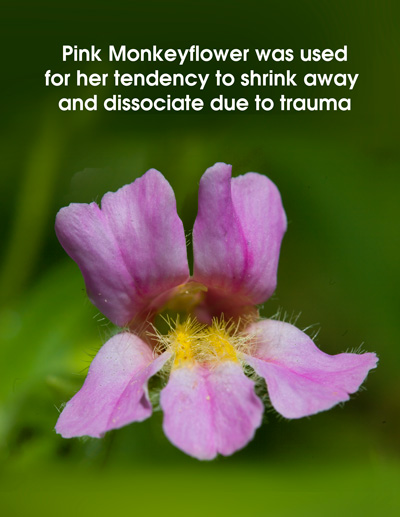 - To begin treatment for her tendency to shrink away and dissociate due to trauma: "The Pink Monkeyflower type withdraws in a way that is more pronounced than ordinary shyness, for the soul is attempting to cover deeply internalized wounds from the past. Most frequently, early childhood trauma or abuse — or exploitative and debasing experiences at any phase in life — are the hidden factors in such behavior." (Kaminski and Katz, 2003)