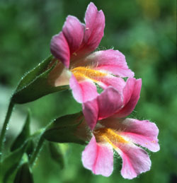 Alcuni botanici collocano questa specie persino in un genere a parte, chiamato Diplacus . Il nome Sticky Monkeyflower (appiccicoso) gli deriva dalle foglie resinose, una caratteristica che e' tipica delle piante dei pendii soleggiati e aridi, dove infatti questo fiore cresce. Il suo habitat varia dal sud Oregon fino a tutta la California, dove e' particolarmente abbondante nelle colline costiere della California centrale. Il fiore ha molte variazioni di colore: dal rosso all'arancio al salmone chiaro. I fiori dal delicato colore arancio, quelli piu' comuni, sono usati per la preparazione dell'essenza. La pianta fiorisce dalla meta' primavera fino all'estate. Sia i fiori, sia le foglie crescono in coppie opposte. Sticky Monkeyflower si rivolge a tematiche relative al secondo chakra, la sessualita' e le relazioni, la paura dell'energia del calore e del legame. E' indicato di solito per coloro che sono stati feriti in una relazione e hanno paura dell'intimita'. La loro sessualita' puo' essere quindi stata repressa o espressa senza connessione con il cuore. La lezione del fiore e' quella di sperimentare la sessualita' e l'intimita' attraverso un vero e altruistico collegamento con il cuore. Pink Monkeyflower Mimulus lewisii