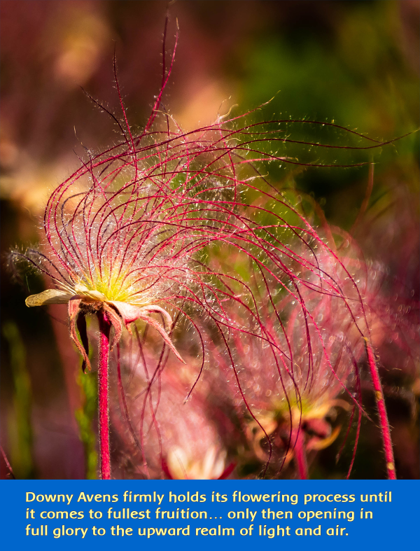 When one contemplates the unique “speaking” of the Downy Avens, we are impressed with the exquisite polarity of a contained interior space that firmly holds its flowering process until it comes to fullest fruition, and only then opening in full glory to levitational forces.